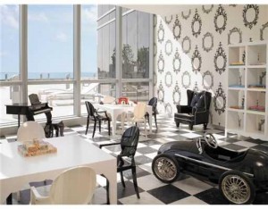 - Children’s room featuring a “baby” grand piano and vintage-style toy car